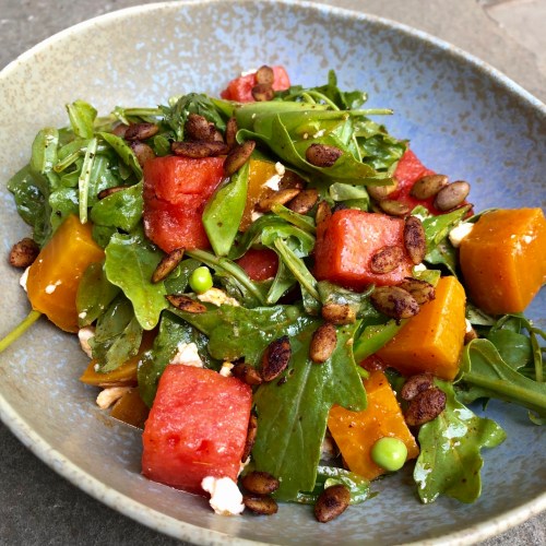 Preheat oven to 400F. Cut the squash in half and scoop out all the seeds. Rub or brush a little olive oil on all the cut and scooped surfaces and place on a parchment-lined baking sheet cut-side down. Bake for 45 minutes or until flesh is tender when pierced with knife or fork. Set aside until cool enough to handle.