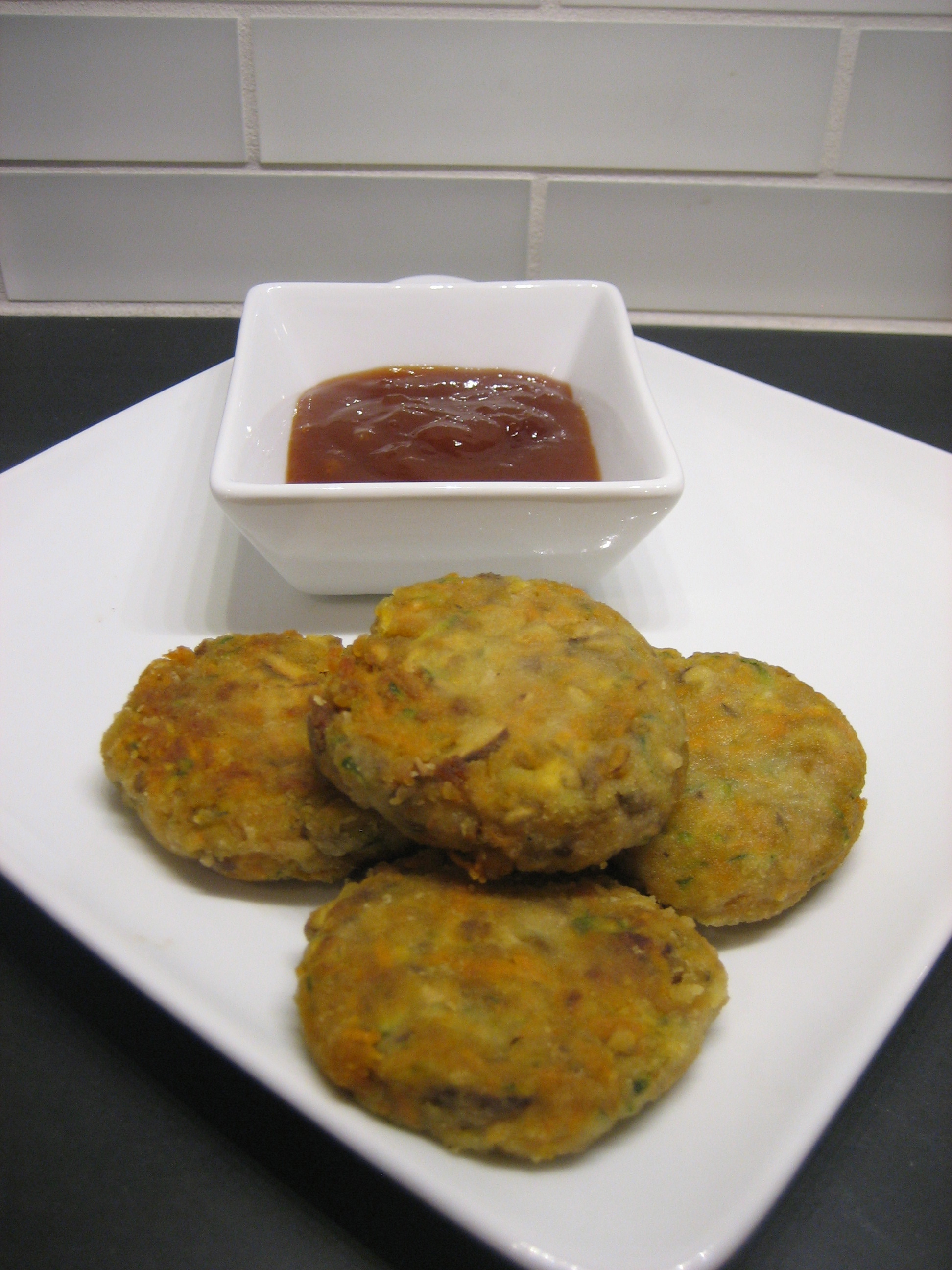 Grate the carrot and zucchini on medium-fine. Squeeze out the excess liquid and put in a medium-size mixing bowl. Grate the yam or sweet potato and add into the mixture in the bowl. Add in all the other ingredients except the bread crumbs. Add a couple spoonfuls of the breadcrumbs and stir to combine. Add in more breadcrumbs if necessary until you have a mixture that holds together well and is not too wet.