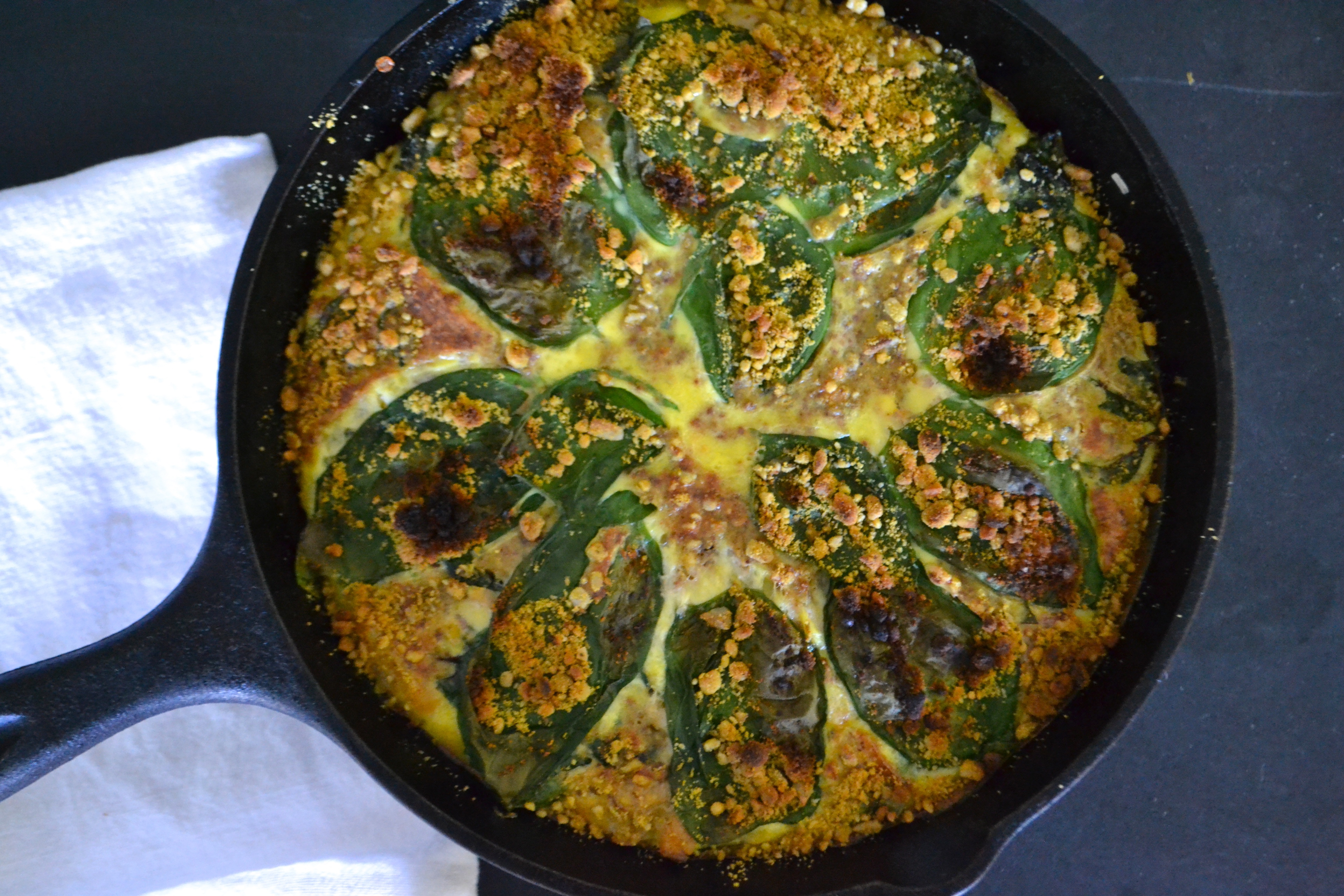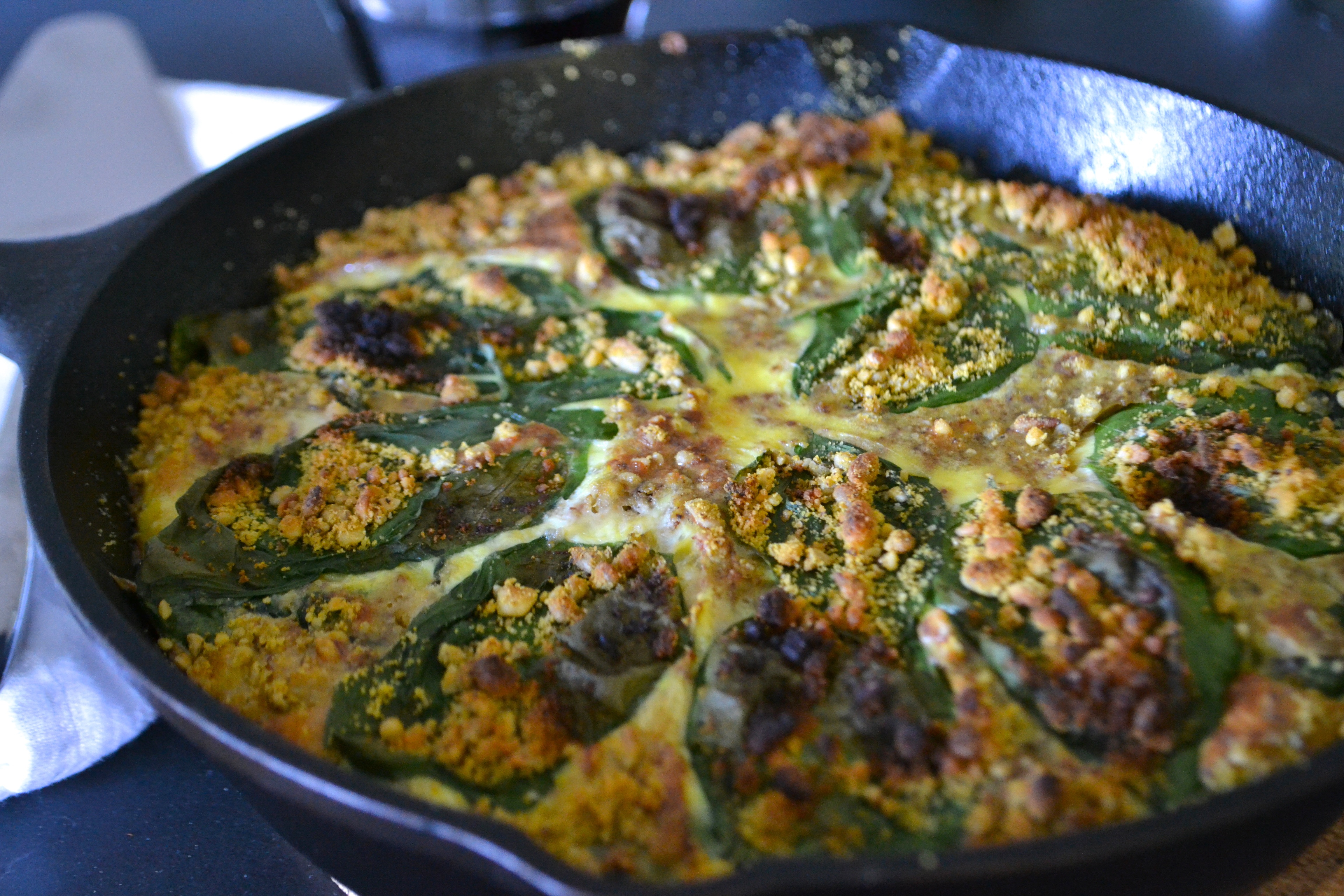 Lay the basil leaves on top of the egg mixture and sprinkle all with Parmesan cheese (or faux). Place under the oven until the egg is completely set and golden brown.