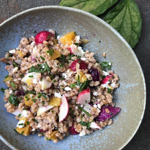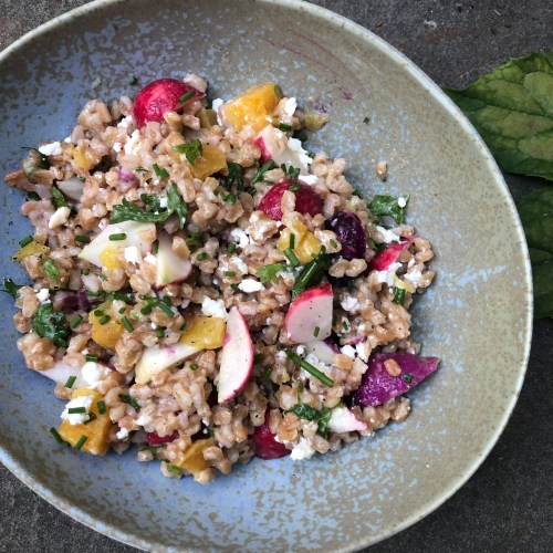 Back to the food… I love this salad! I’ve been making it nearly every week since May, and I definitely rate in among my top five favorites. It boasts beautiful color, complex flavor and texture, and you can easily source its ingredients all summer and into autumn. It has just the right combination of sweet, savory, soft and crunchy, and the chili-lime vinaigrette gives it just a little added kick. You can make a vegan version leaving out the feta.