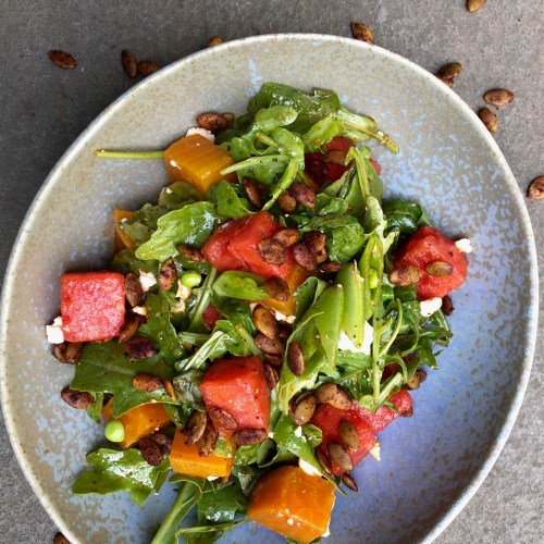 Add cut watermelon, snap peas and arugula and toss to combine.