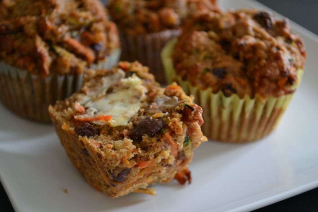 In a medium-sized bowl, mix together flours, baking powder, baking soda and salt. Set aside.