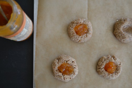 Preheat the oven to 350°F. Combine all the ingredients except for the jam together in a large bowl with a wooden spoon. Form into tablespoonful balls and space them evenly on cookie sheets lined with parchment paper. Using your thumb or index finger, make an indent in each cookie. Fill each indent with a small spoonful of jam. Bake until the cookies are a light, golden brown, 18-20 minutes. Do not overbake (i.e., better to be slightly under- than overcooked). Let cool before eating.