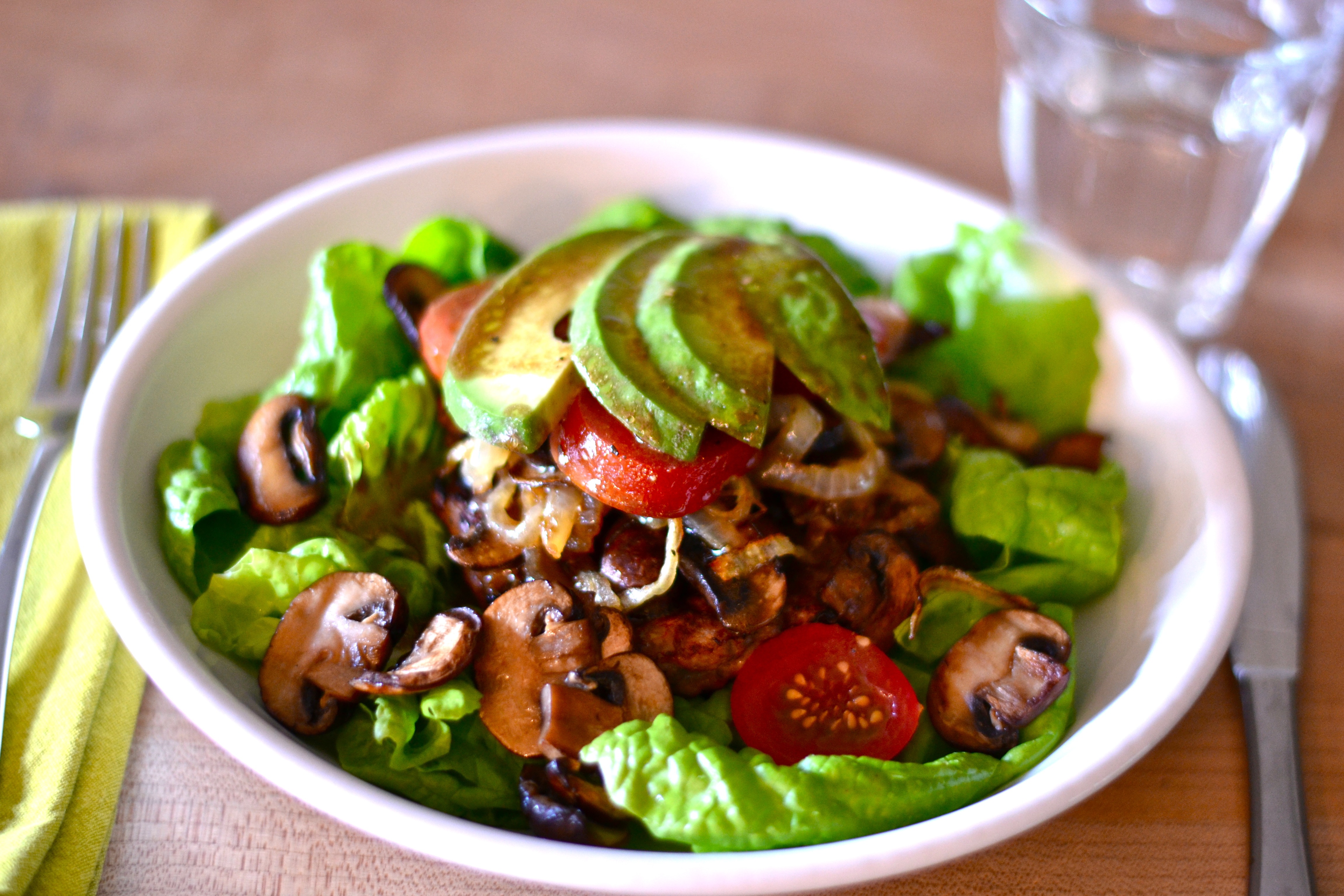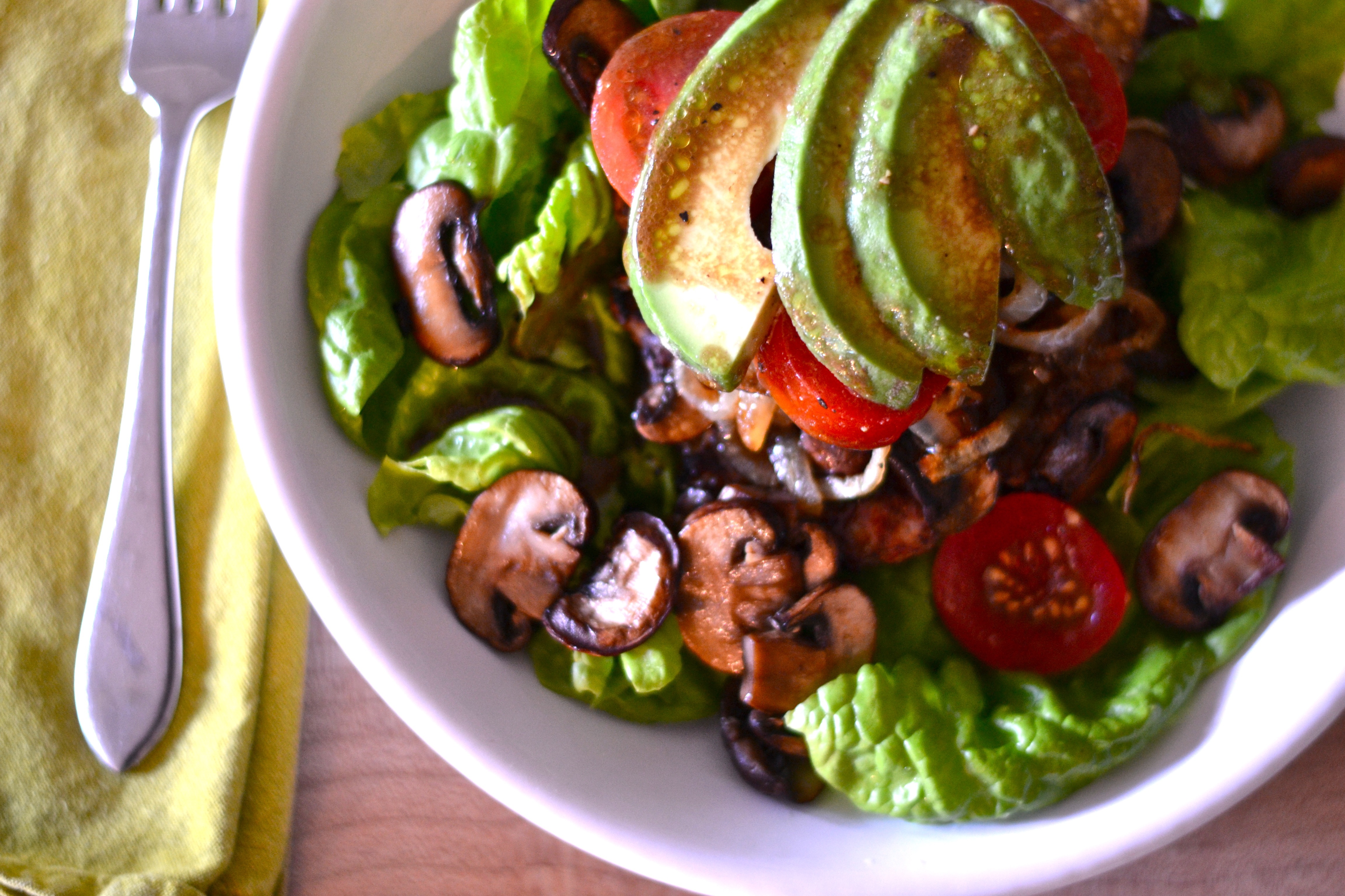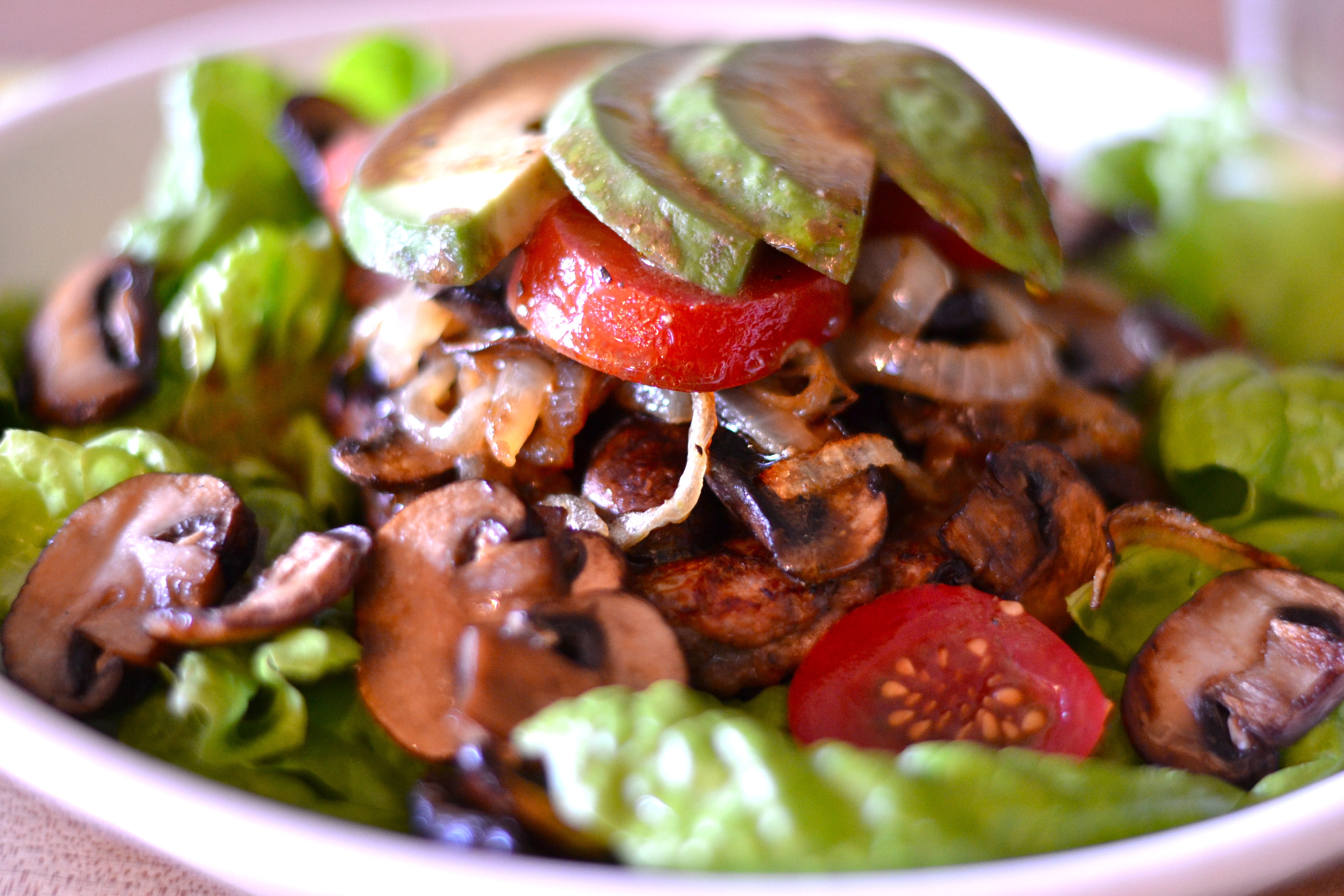 Divide the lettuce onto plates. Top with the burger followed by the mushrooms, onions, tomatoes and whatever else you’re using (except the avocado). Garnish with slices of avocado. Drizzle the dressing over the whole thing. Serve immediately.