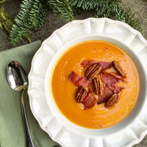 I love this recipe because it’s super easy to prepare (my number one criteria most of the time!), tasty and comforting. I like to top it with toasted prosciutto and toasted pecans, but you could easily sub a vegetarian or vegan option. I’ve also topped this soup with spiced, toasted pepitas (see my recipe here). Of course, you don’t have to garnish your soups at all, but I think it’s nice to have a contrast of textures when you’re making a super smooth soup. This recipe serves 4-6 depending on whether you’re serving it as one of several courses or whether it’s the main attraction.